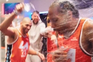 赛后,快船更衣室疯狂泼水庆祝,莱昂纳德浑身被浇透。