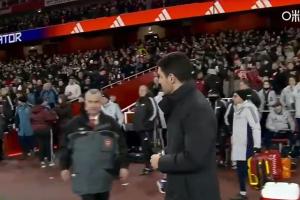 赛后,枪手主帅阿尔特塔先是和助教击掌相庆,但随后他环顾对面一圈,先后回了几次头都没看到维拉主帅埃梅里来握手,只好跳过这个环节进场恭喜自家球员。
