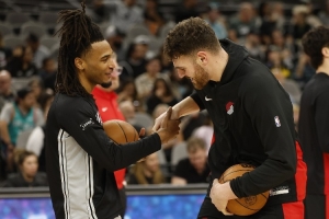 赛前,马刺后卫卡斯尔和开拓者内线克林根被拍到在场边嬉戏玩耍。